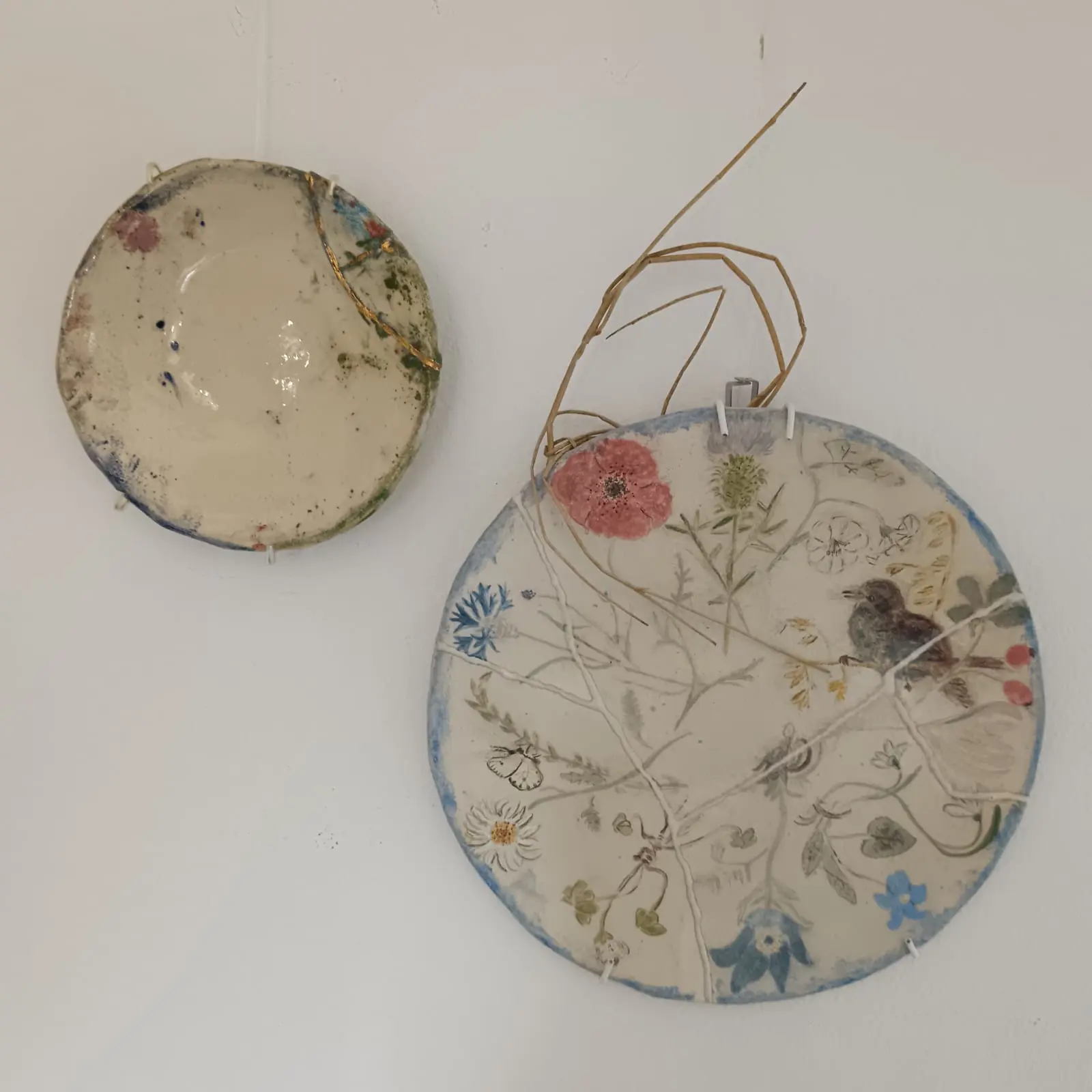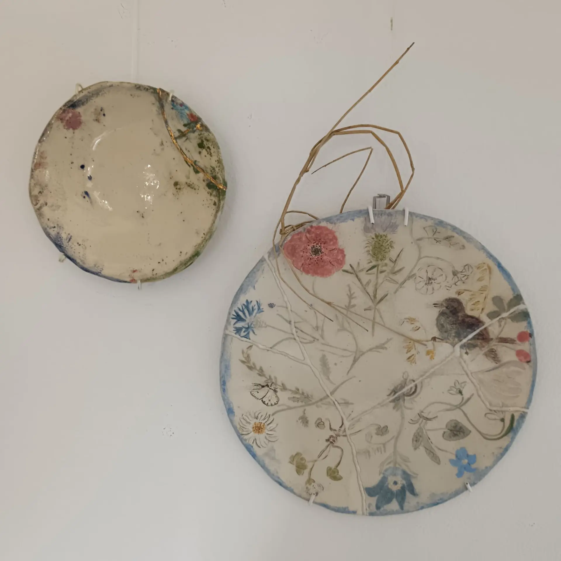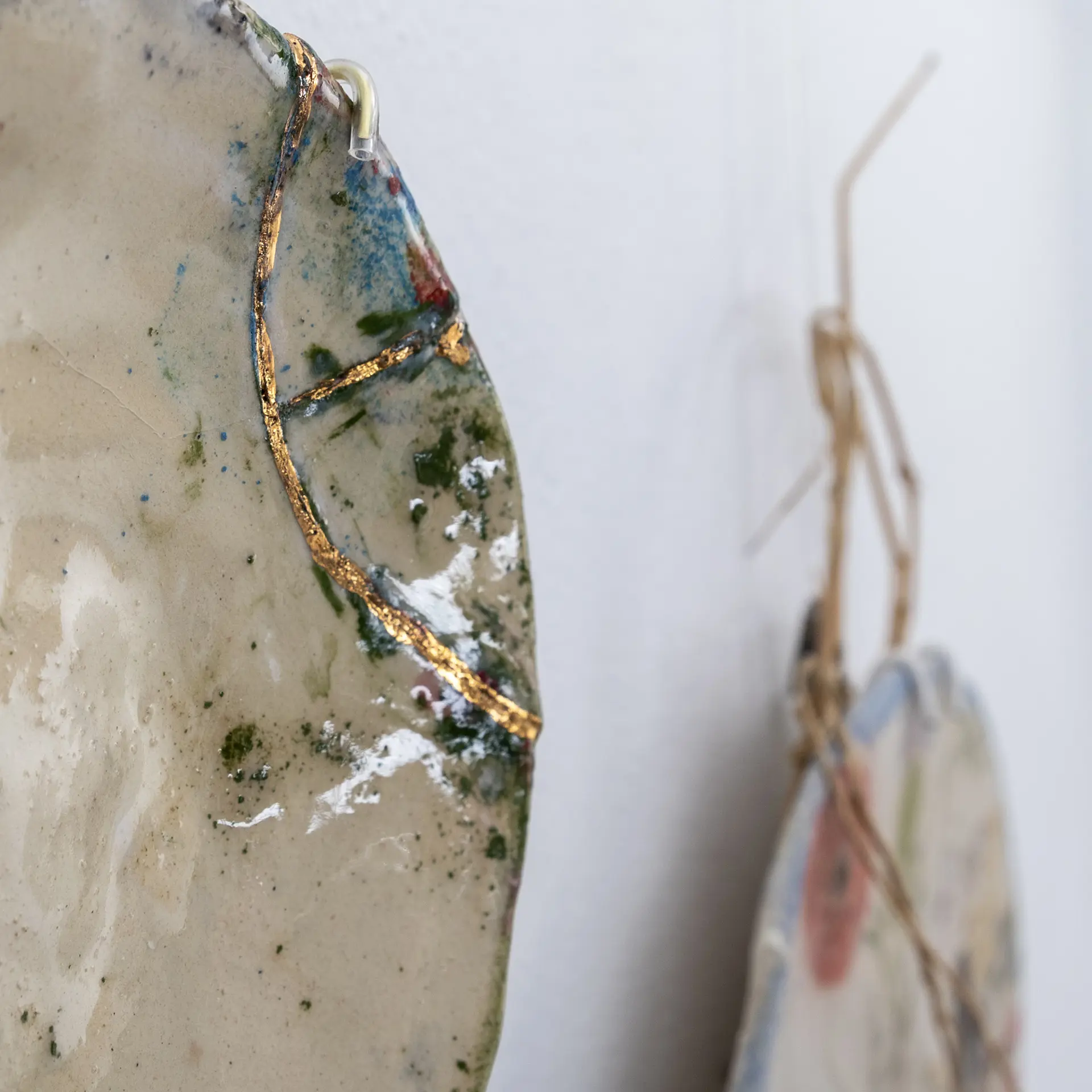 Platte mit repariertem Bruch:aus dem Riss ergibt sich das Thema, die Narbe wird zum Zeichen.