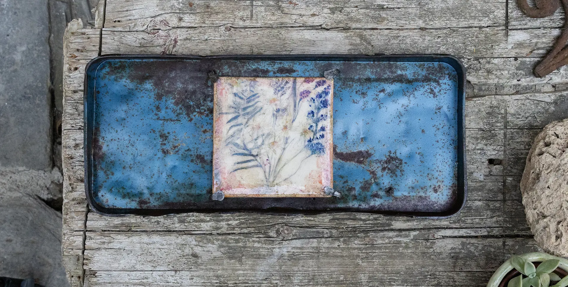 Oxidiertes Metall bewahrt die Zerbrechlichkeit und schafft Kontrast.